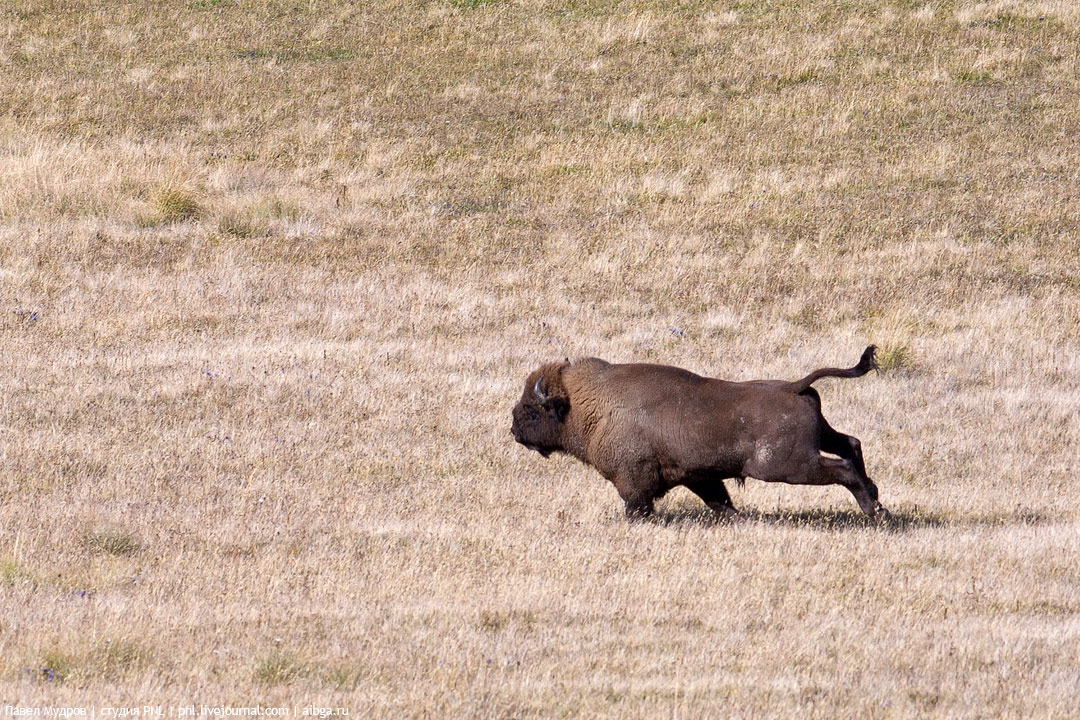 2. Самец зубра убегает по альпийским лугам. Август.