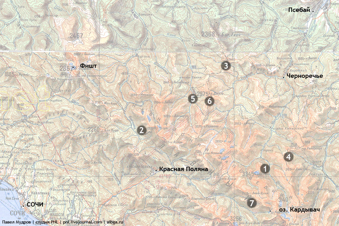 1. Вид на массив высшей точки Краснодарского края — Цахвоа из долины Юхи. Сентябрь.