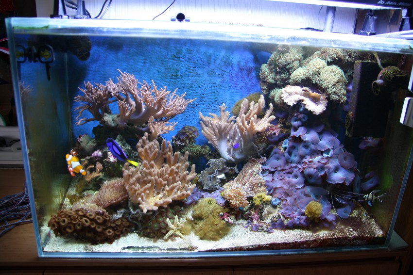 морской аквариум с тумбой и сампом, полностью укомплектован, мягкий риф + рыбы, р-р тумбы 1600х60х80 аквариум 1005х60х65, стекло 10 мм с верхней стяжкой. Продаётся только комплектом.Упор сделан на мягкий риф ( кораллы ), порядка 15 видов.