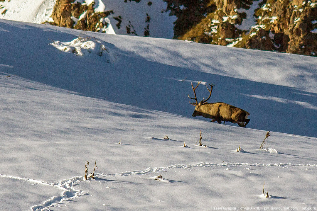 7. С первыми снегами поздней осени оленям становится труднее перемещаться из долины в долину. Вот и этот олень безуспешно пытается подняться к перевалу Луган, увязая в снегу. Октябрь.