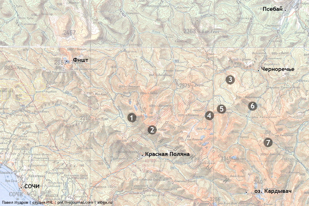 2. Северные склоны массива Ассара. На вершине угадываются остатки триангуляционного пункта — металлической пирамидки, погнутой снегом и ветрами. Июль.