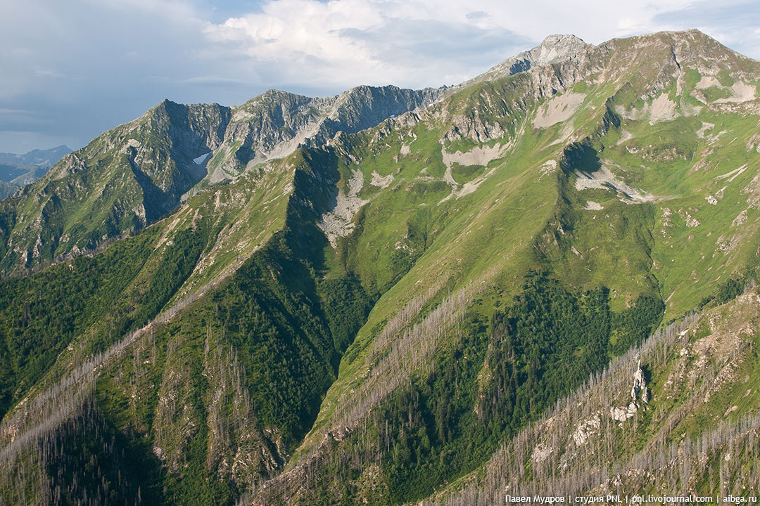 2. Хребет Кочерга. В нижней части склонов виден мертвый хвойный лес — результат заболевания леса бактериальной водянкой пихты. Август.