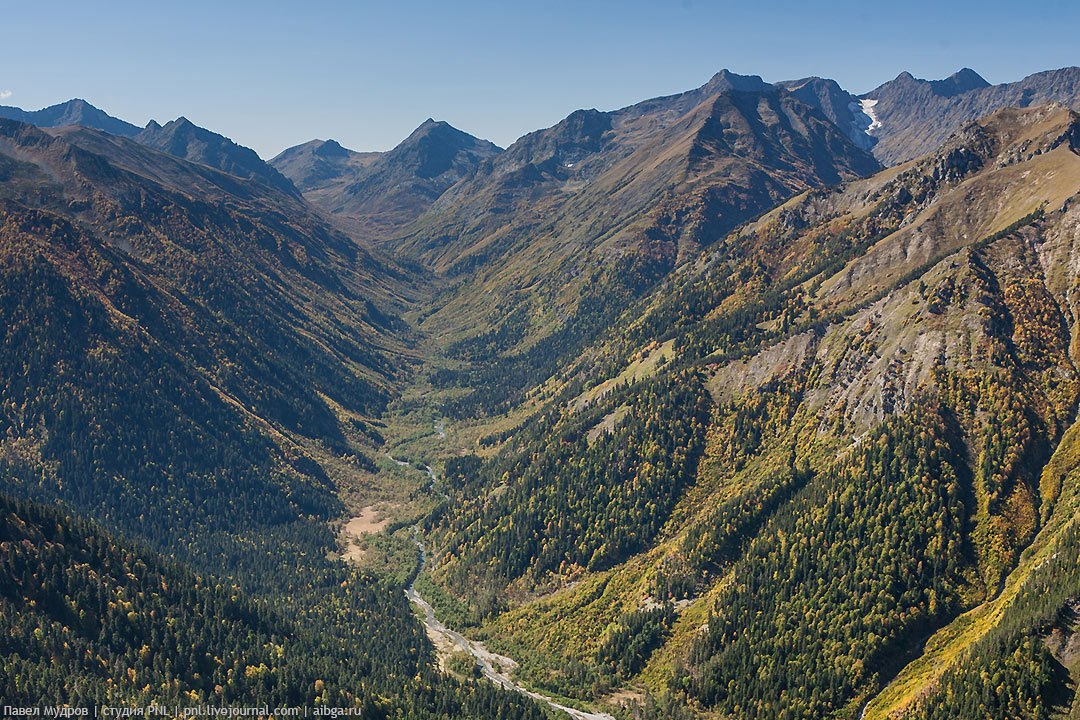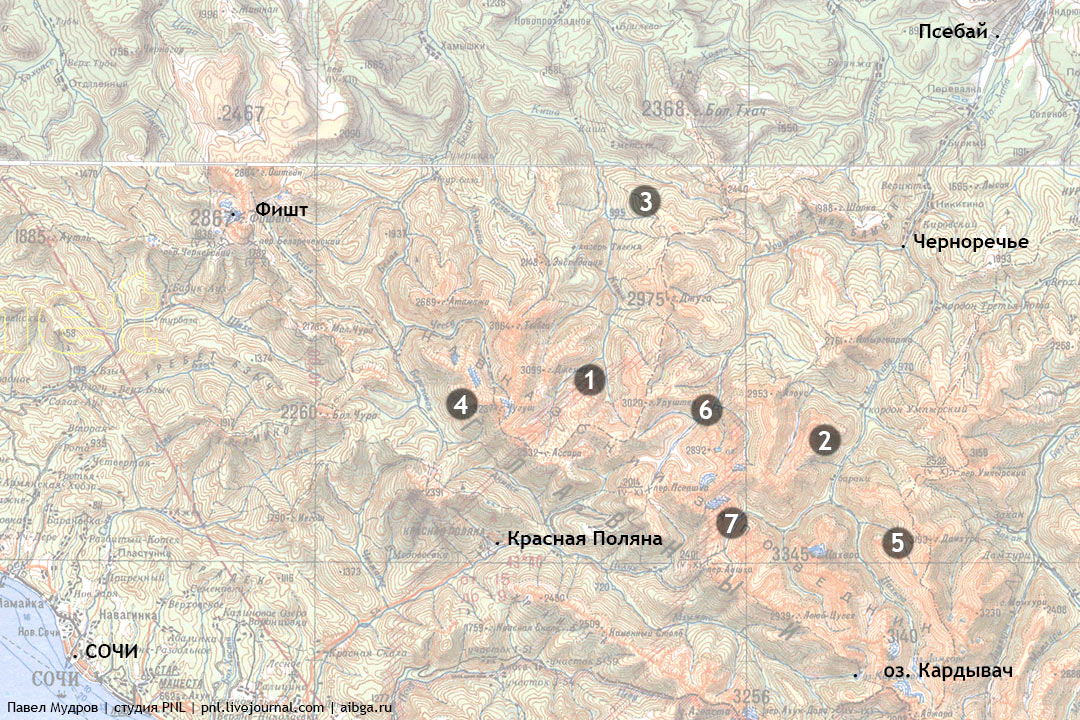 6. Долина реки Уруштен на ее достаточно прямом участке — от слияния с Челипси вверх по течению до лагеря Холодного. На полпути направо угадывается глубокая долина притока — это долина Синей (в ее верховьях даже виден ледник — это ледник Дзитаку или Синереченский). В верховьях Уруштена видна вершина горы Минометной — с нее, как видно, хороший обзор Уруштена для миномета, этим и пользовались при обороне Кавказа в ВОВ.