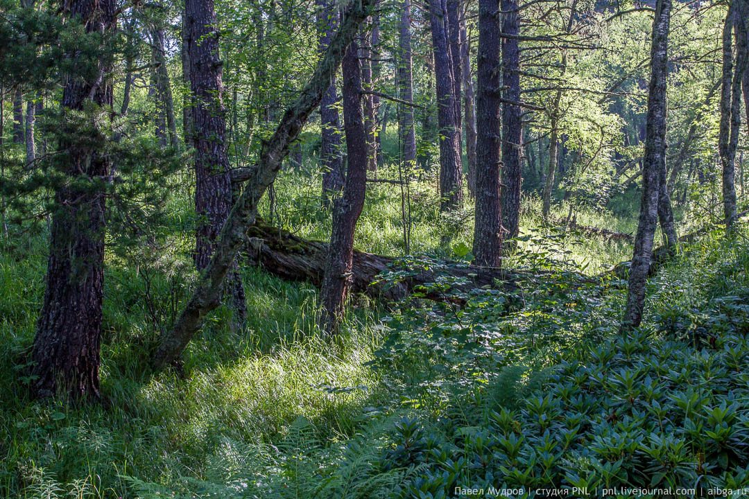 3. Типичный лес в верхней части лесистых гребней северных склонов заповедника. Береза и сосна здесь перемешаны с подлеском из рододендрона. Это Солонцовый хребет. Июль.