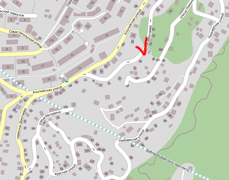 Дублер идет с Фабрициуса, пробивая гору, выходит на Пионерскую и далее под горой на Параллельную (там где кран упал). Склон горы где расположен портал тоннеля, выходящего на Параллельную, со стороны Пионерской и есть улица Докучаева.
