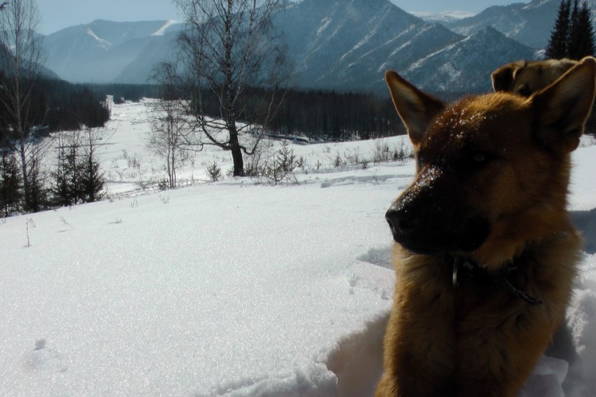 Решила сходить на одну из смотровых «площадок» — устье Курагана, впадающего в Катунь. От дома 1,5км примерно по дороге + 200м по глубокому снегу без тропы..)