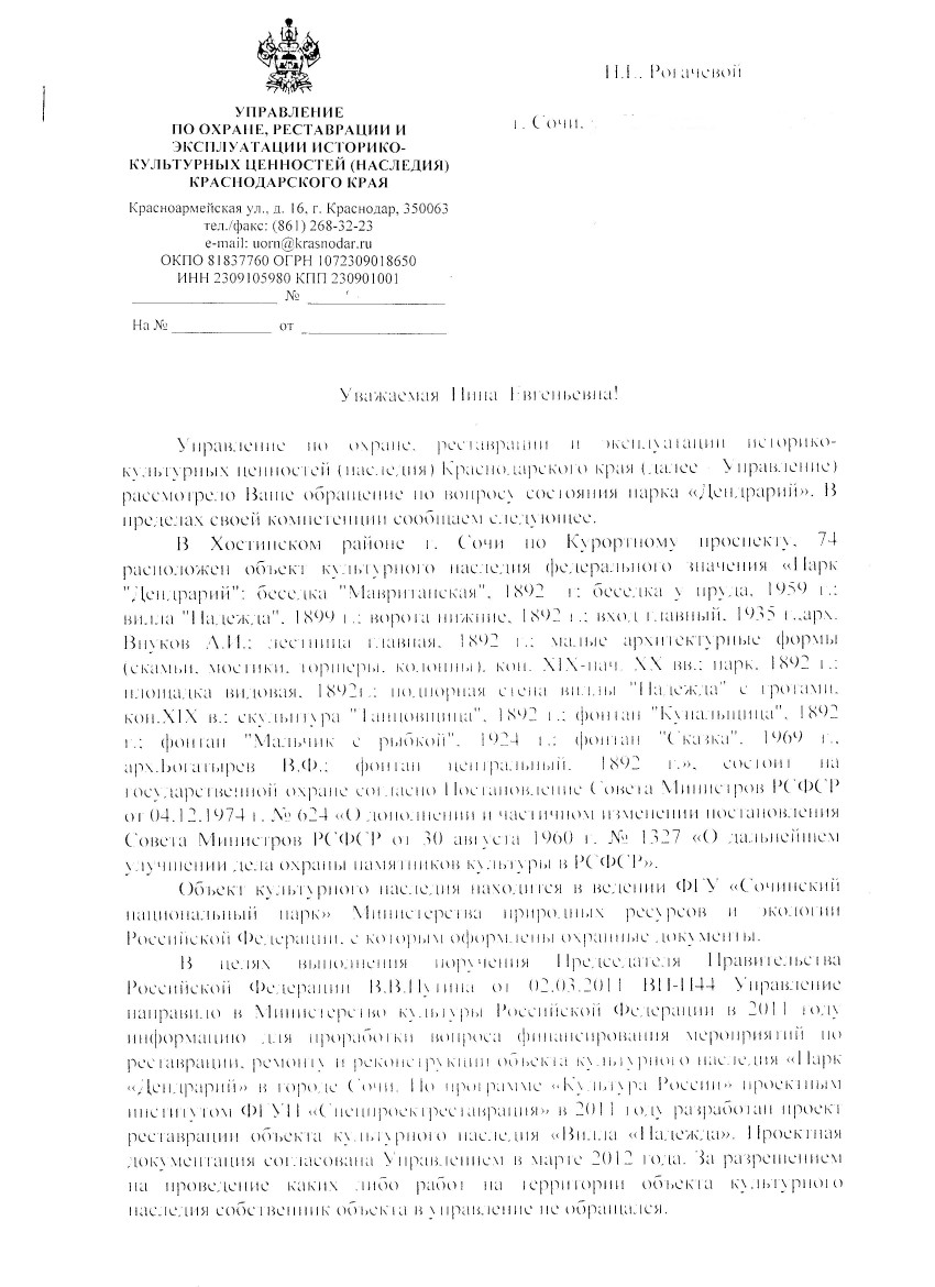 Как следует из письма, Управление обратилось в Кубанское управление Росохранкультуры с просьбой провести проверку доводов изложенных в обращении жителей Сочи.