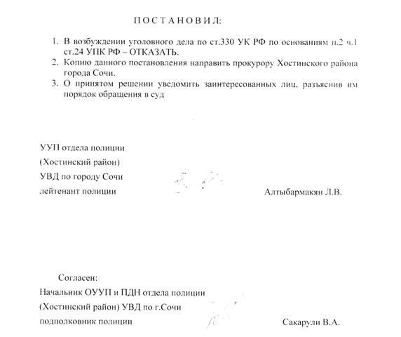 Вчера я получила ответ из отдела полиции (Хостинский район) УВД по г. Сочи, которым я была уведомлена о том, что по результатам проверки принято решение об отказе в возбуждении уголовного дела по ст. 330 УК РФ. К уведомлению было приложено постановление об отказе в возбуждении уголовного дела от 17.06.2013 года. Однако на конверте стоит штамп с датой от 03.07.2013 г.