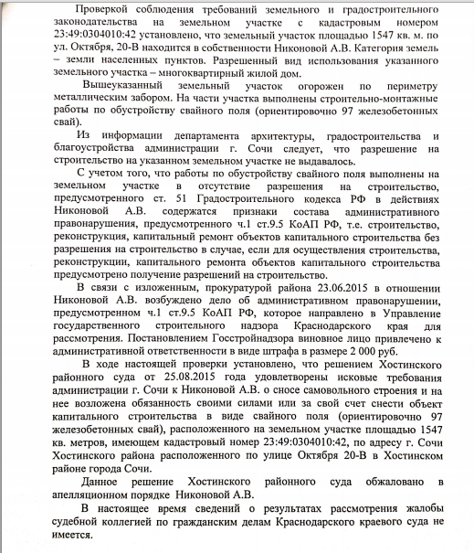 20 октября 2015 получен ответ Хостинской прокуратуры по данному участку