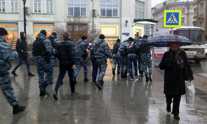 Сначала молодые люди придрались к омоновцу, стоявшему возле автобуса. Направив на него объектив камеры, они стали требовать объяснений, почему белый автобус перегородил пешеходный переход. В ответ из автобуса выскочило около 10 коллег «парковщика». Активистов жестко задержали и посадили в этот самый злополучный автобус.