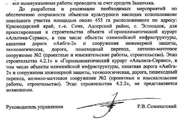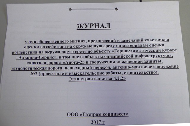 Речь идет об обсуждении материалов оценки воздействия на окружающую среду по объекту «Горноклиматический курорт «Альпика-Сервис», в том числе объекты олимпийской инфраструктуры, канатная дорога «Аибга-2» и сооружения инженерной защиты, технологическая дорога, пешеходный переход, антенно-мачтовое сооружение №2 (проектные и изыскательские работы, строительство). Этап строительства 4.2.2.»