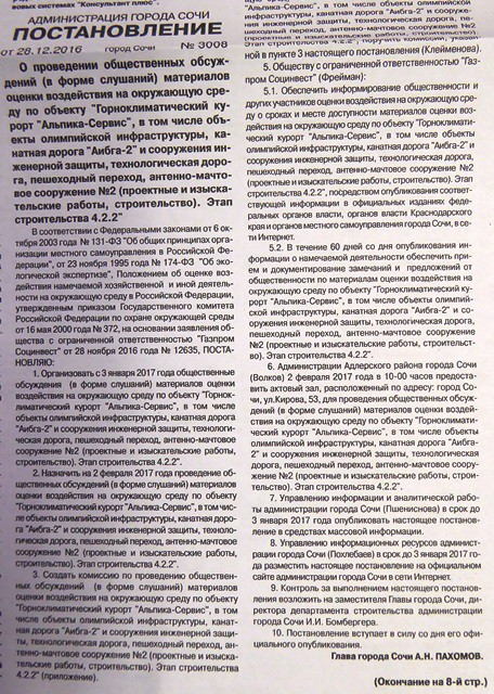 Самое интересное в том, что в Постановлении Администрации города Сочи № 3008 от 28.12.2016г. «О проведении общественных обсуждений (в форме слушаний) ..." назначена ДАТА ПРОВЕДЕНИЯ — 2 февраля 2017г.