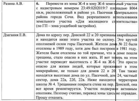 Несмотря на протесты против необоснованного изменения назначения участков, из 98 вопросов только по двум были отказы комиссии по слушаниям: по Пластунской, 200 и по ул.Пасечной. Это было печально, но хоть где-то вроде-бы удалось остановить строительное безумие. Комиссия по слушаниям проголосовала против этих, противоречащих Градостроительному Кодексу, изменений.