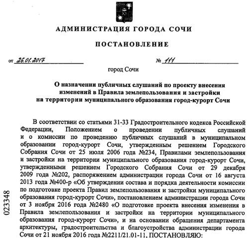 (см. пункт 5 статьи 14 Решения Городского Собрания Сочи от 25.07.2006 № 234 «Об утверждении Положений о проведении публичных слушаний и о комиссии по проведению публичных слушаний в муниципальном образовании город-курорт Сочи»)