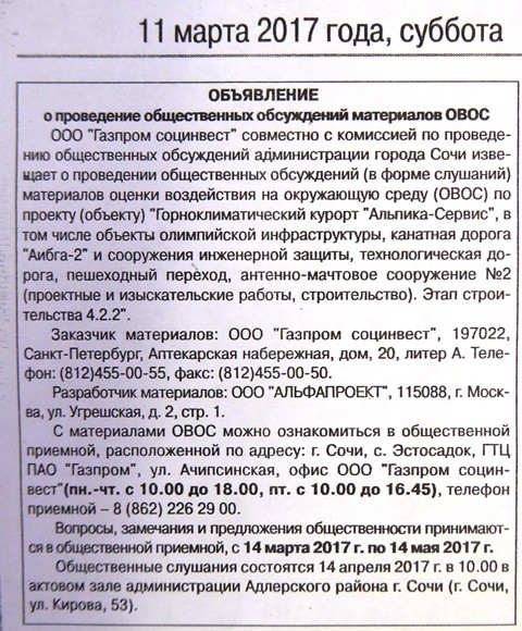 Завтра, 14 апреля 2017 г., в 10-00 в актовом зале администрации Адлерского района города Сочи объявлены общественные слушания по проекту «Горноклиматический курорт „Альпика-Сервис“, в том числе объекты олимпийской инфраструктуры, канатная дорога „Аибга-2“ и сооружения инженерной защиты, технологическая дорога, пешеходный переход, антенно-мачтовое сооружение № 2 (проектные и изыскательские работы, строительство). Этап строительства 4.2.2.».