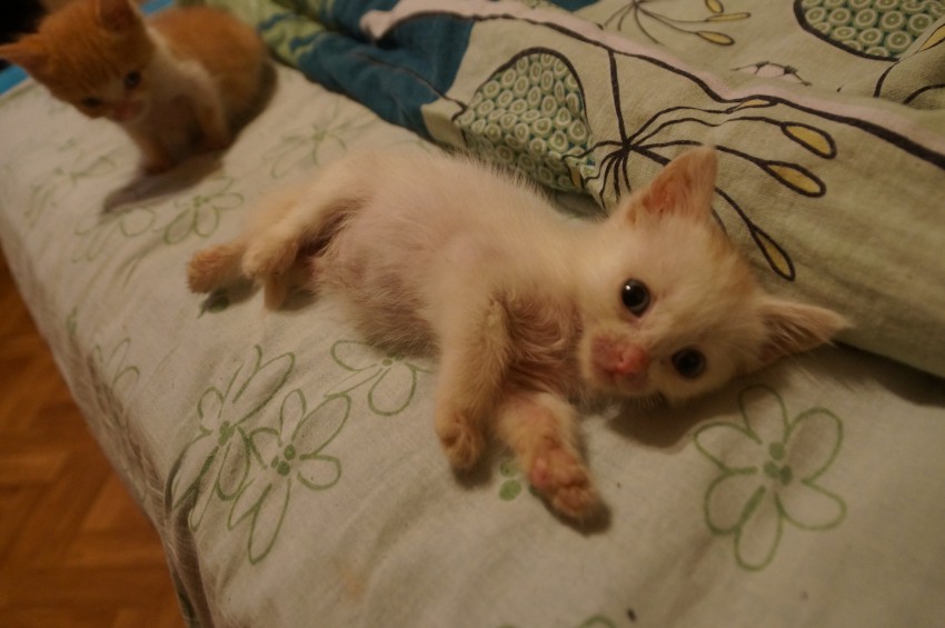 Котятки 1,5 мес. пацанята (2 котика) в очень, очень добрые и заботливые руки!Малявки которые сейчас у меня на передержке идут потихоньку на поправку и через недельку уже будут готовы обрести новый дом и любящих хозяев! Котята очень ласковые, игривые и очень любят внимание! Кушат уже все уже сами хорошо! Я им даже временные имена дала: беленький это «Беляшик», а рыжий это «Чебурек»:)