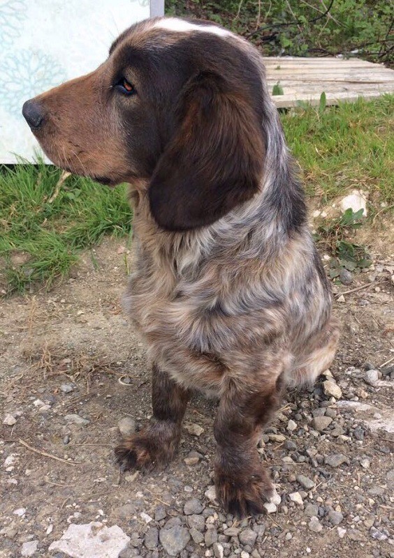 Небольшого роста, короткие лапки, короткий хвост, интересный окрас преимущественно коричневого цвета, шерсть средней длины, карие глаза. Здоров.