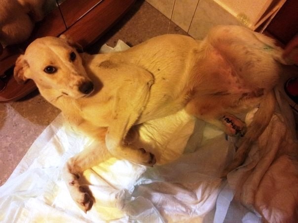 Открытый перелом задней лапки быстро воспалился и перешел в сепсис. Собака лежала на газоне и умирала. Ни кому не было до нее дела. Но случилось и в ее жизни чудо, двое неравнодушных людей, мама с дочкой, заметили ее, и бросив все дела повезли спасать.