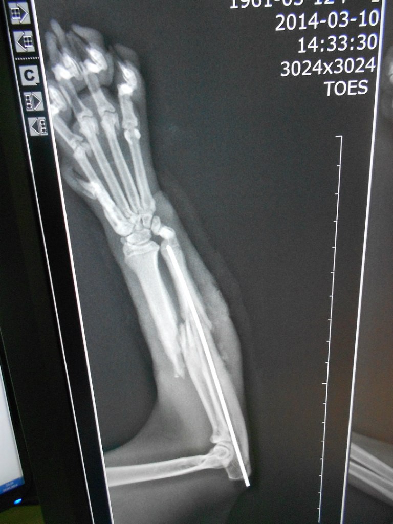 По истечении двух недель со дня операции был сделан рентген и оказалось что только в одной кости стоит спица, а вторая кость так и сломана!!!