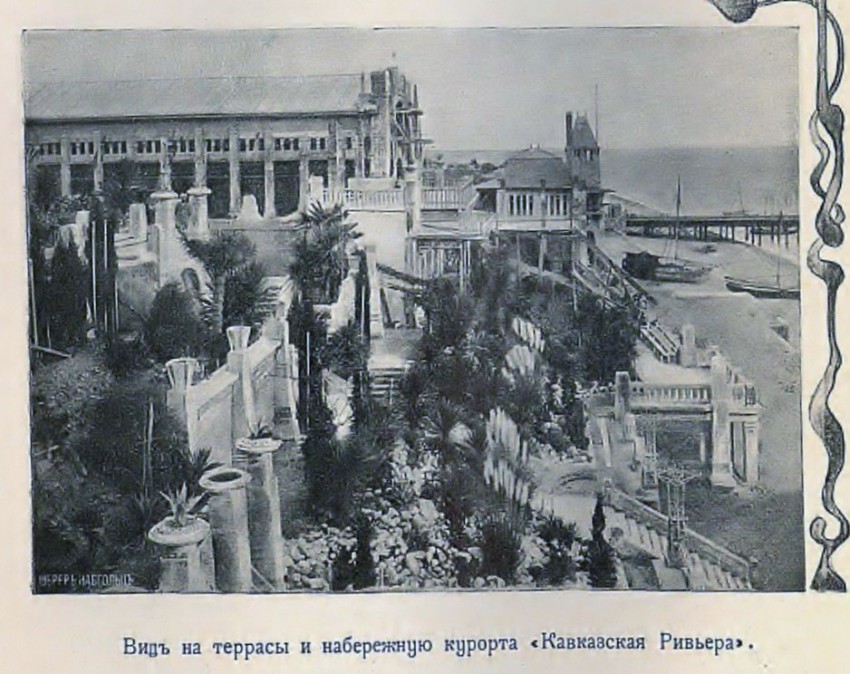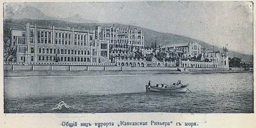 Подъезжая к Сочи на пароходе, вы невольно поражаетесь грандиозностью и красотой зданий «Кавказской Ривьеры»; точно прямо из воды выдвигаются массивы этого курорта. На самом берегу моря, в нескольких десятках шагов от казенной пристани начинается ряд зданий дивной архитектуры, соединенных между собою утопающими в субтропической зелени террасами, колоннадами, арками.