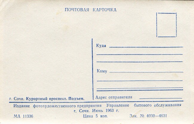 В этом самом альбоме сохранилась целая подборка фотографий-почтовых открыток, изготовленных Фотохудожественным предприятием «Управление бытового обслуживания г. Сочи».