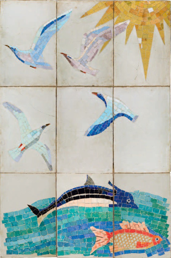 Кроме того, в 1964г. было создано мозаичное панно 2х2м по эскизу 1939г. (для оформления станции метро «Маяковская»), основной сюжет которого повторяет не реализованные в натуре эскизы для оформления фасада санатория министров СССР г.Сочи
