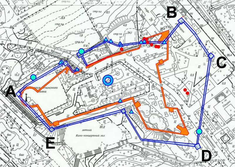 Далее стена крепости продолжается под ресторанным комплексом «Каскад» до края естественного оврага где стоит девушка, точка «В» на карте, граница которого совпадает с современным Курортным подъемом (бывший Мамонтовский спуск затем Пролетарский проспект).