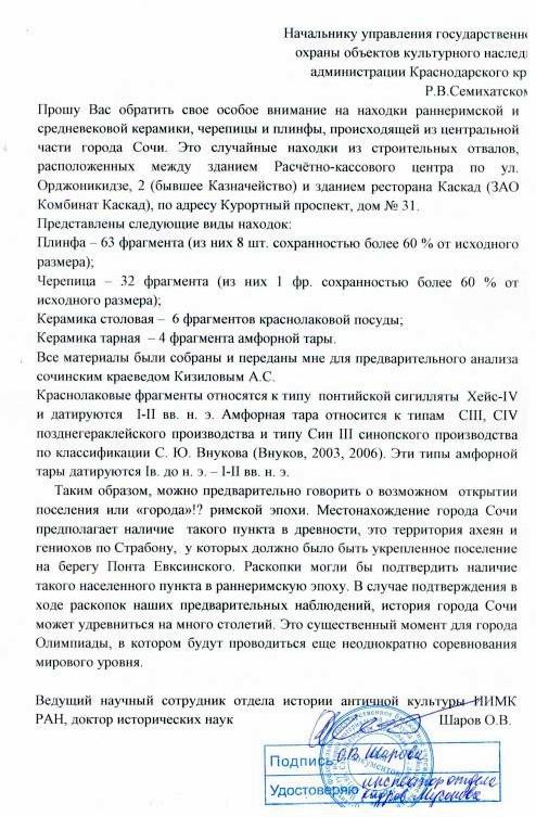 На основании уже этого документа можно утверждать, что город Сочи родился в первые десятилетия первого века нашей эры, а не 21 ноября 1838 года, как это считается сейчас. Подробную информацию можно найти на проект «ФОРТ».