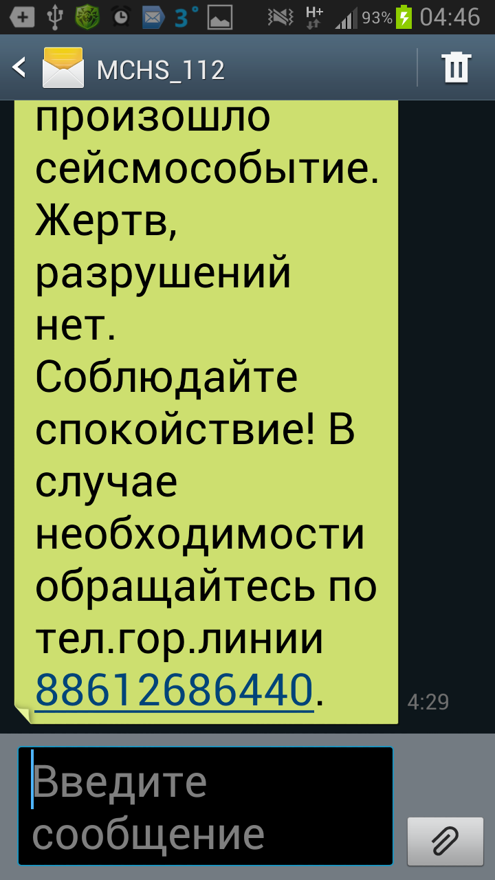 После того как миллионы нервных клеток погибло не зная куда бежать и что делать при землятрясении… и вроде уже всё стихло и нервы почти успокоились и уже можно ложиться спать, приходит утешительное и ободряющее сообщение на Мегафон от МЧС в 04:40 «От: MCHS_112