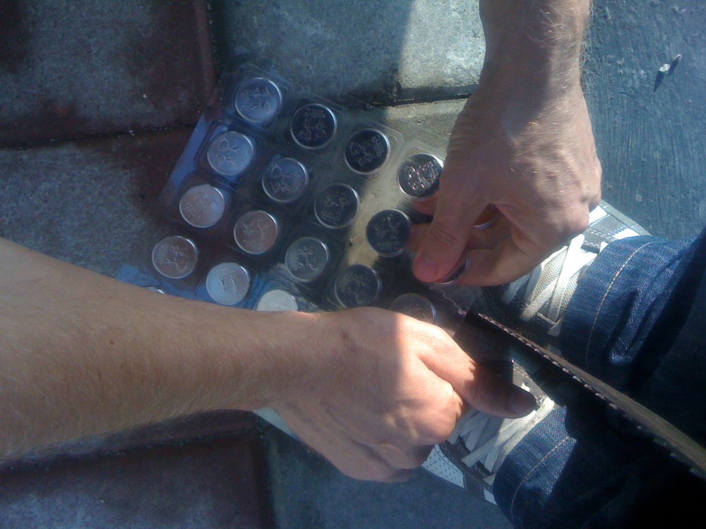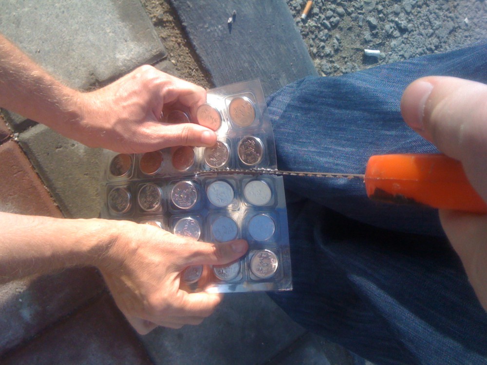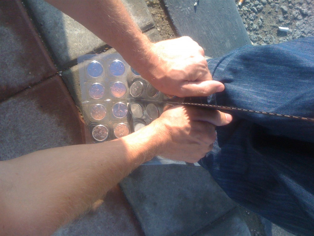 Уже подъезжая к аэропорту, друг решил все монеты не брать, т.к. вес все-таки, да и родственников не так много. Поэтому решил ограничиться 10 комплектами (по 3 вида) монет. Поиски ножа в машине ничего не дали, а из колюще-режущего была найдена только …. пила )))).