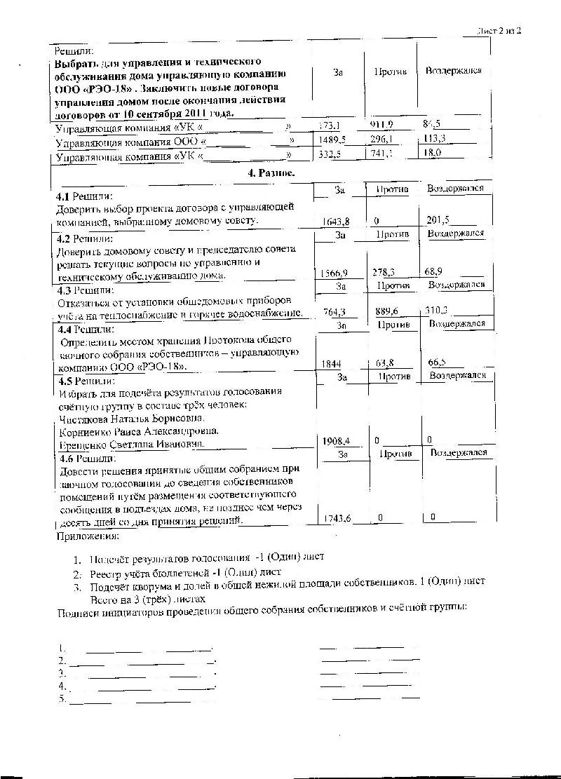 Мы пришли попросили протокол у Ляхового А.И. Какой умный чиновник, законы знает, пишите заявление через 30 дней я протокол Вам покажу. Через десятые руки попал протокол собрания. Подписан только секретарем. Вопросы протокола и объявления о собрании не совпадают. Написано присутствовало 32 собственника, а кто конкретно не указан. Список собственников с подписями о согласии за повышение тарифов отсутствует. Причем до сих пор домком не знает, что голосовать надо по квадратным метрам собственника. Просто идет предложение повысить тариф с 10 р 06 коп до 12 руб. и все. На какие цели, соответственно не расписано вообще как распределяется данная сумма по строкам расходов. На собрании дан отчет ООО «Возрождение», потратили на ремонт 153 тыс. рублей. Кто рассматривал предложения, что то сделать этого нет. Соответственно смета составлена не была. На собрании не утверждена. Куда реально потратили деньги ООО «Возрождение» непонятно. В доме постоянные аварии по холодному и горячему водоснабжению. На письменные обращения «где деньги» холодное молчание. Разве так можно работать? А как у Вас?