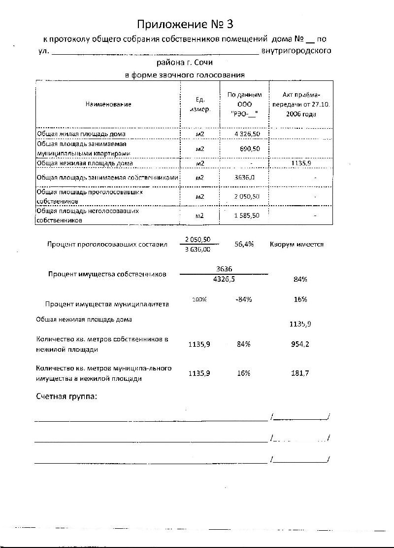 долженобязан вестись от общей нежилой площади дома. А это 1135,9 м2.И ещё. Кол-во голосов собственников участвовавших в голосовании= 2050,5 м2. А собственники + муниципалы имеют 4326.5 м2. Итого имеем: процент проголосовавших= 0.47% \2050,5: 4326,5\. Кворума нет. Собрания нет.Или я неправ?