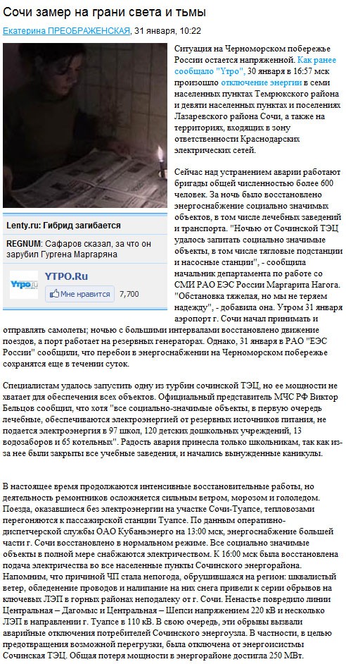 Вчера около 17:50 на значительной части м/р Бытха отключили свет. Дорогостоящие звонки в безответственные городские службы и прочие «горячие линии» успехом не увенчались, там либо «занято», либо после пары гудков идёт сброс вызова. Нафига нам плодят и вешают на шею этих дармоедов?На прошлой неделе сидели без воды, теперь нет света, до этого тоже чего-нибудь не было, на работе тоже постоянные отключения, зато коммунальные тарифы исправно растут. Похоже бывший курорт под пятой голимпийских ублюдков превратился в бесконечный коммунальный ад. Утром тупо невозможно было погладить вещи. Тем временем в холодильнике гора недешевых продуктов готовится к отправке в мусорное ведро.