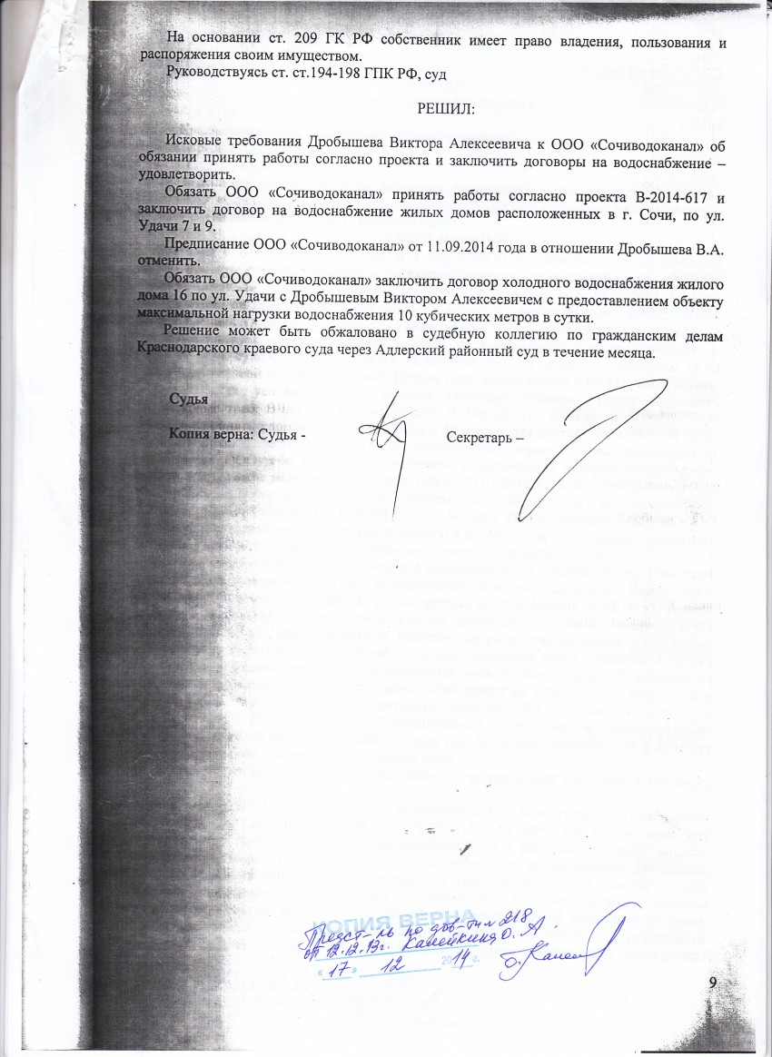 • Есть решение суда, обязывающее ООО «Сочиводоканал» подключить объекты к сетям и заключить соответствующие договора.
