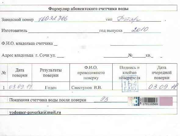 С 1 января 2016 года, в связи с отсутствуем утвержденного тарифа на проведение поверки по месту установки ИПУ (водомеров), Сочинский филиал ФГБУ «Краснодарский центр стандартизации и метрологии» приостановил прием заявок.В настоящее время поверка проводится Сочинским филиалом ФГБУ «Краснодарский центр стандартизации и метрологии» только со снятием водомера.