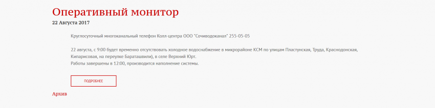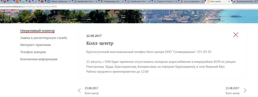 Вечером отключили холодную воду, верхняя Вишнёвая, частный сектор. Звонили долго и настойчиво на «круглосуточный многоканальный телефон единой диспетчерской службы», нет ответа. Точнее, отвечает автоответчик. С утра вода была, но сейчас опять нет. На упорные звонки опять же никто не может ответить. Water, почему нет своевременной информации? И куда звонить, а вдруг авария? И вопрос вопросов: каким образом Водоканал собирается компенсировать причинённые неудобства гражданам, периодическими, практически плановыми, отключениями воды? Зайдя на стартовую страницу сайта Водоканала, струхнула-грозит отключениями неплательщикам и кнопочка красная, мол плати! А про отключения воды и аварии ни гу-гу. Либо я плохо искала. Плательщиков Ваших некачественных услуг необходимо уважать.