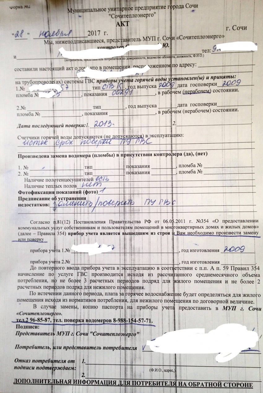 Осталось только дождаться от Сочитеплоэнерго перерасчетов за ГВС и ГВС ОДН, а также разрешения вопросов по самовольно установленным ими ОДПУ, приведение их в соответствие с требованиями коммерческого учета (в том числе поверкой всех комплектующих), возврату излишне собранных средств с жителей домов до момента их официального ввода в эксплуатацию с учетом износа оборудования или демонтажа самовольно установленных приборов до проведения капремонта внутридомовых сетей.