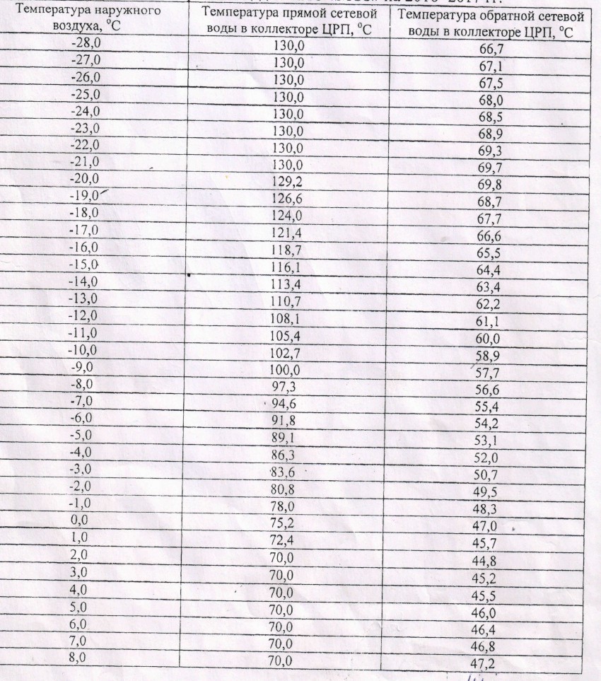 Когда утверждается тариф, МУП «Сочитеплоэнерго» производит расчет, сколько потребуется энергии на предоставление услуги. Температура в квартире должна быть 20-22 градуса. Исходя из этого, рассчитывается необходимая температура воды в теплосетях при той или иной температуре наружного воздуха. Этого требуют нормы СНиП. Документ, отображающий температурный график, должен быть доступен для любого потребителя услуг МУП «СТЭ», однако на официальном сайте предприятия такой информации нет. Более того, если вы в котельной попросите сфотографировать график, вам откажут, как будто это какой-то жутко засекреченный документ с военной тайной. Конечно, это тайна. Если каждый будет знать – легче будет защищать свои интересы в суде. Но мы вам эту тайну откроем (документ был подписан ведущим инженером ПЛН МУП «Сочитеплоэнерго» В. И. Трутневым).