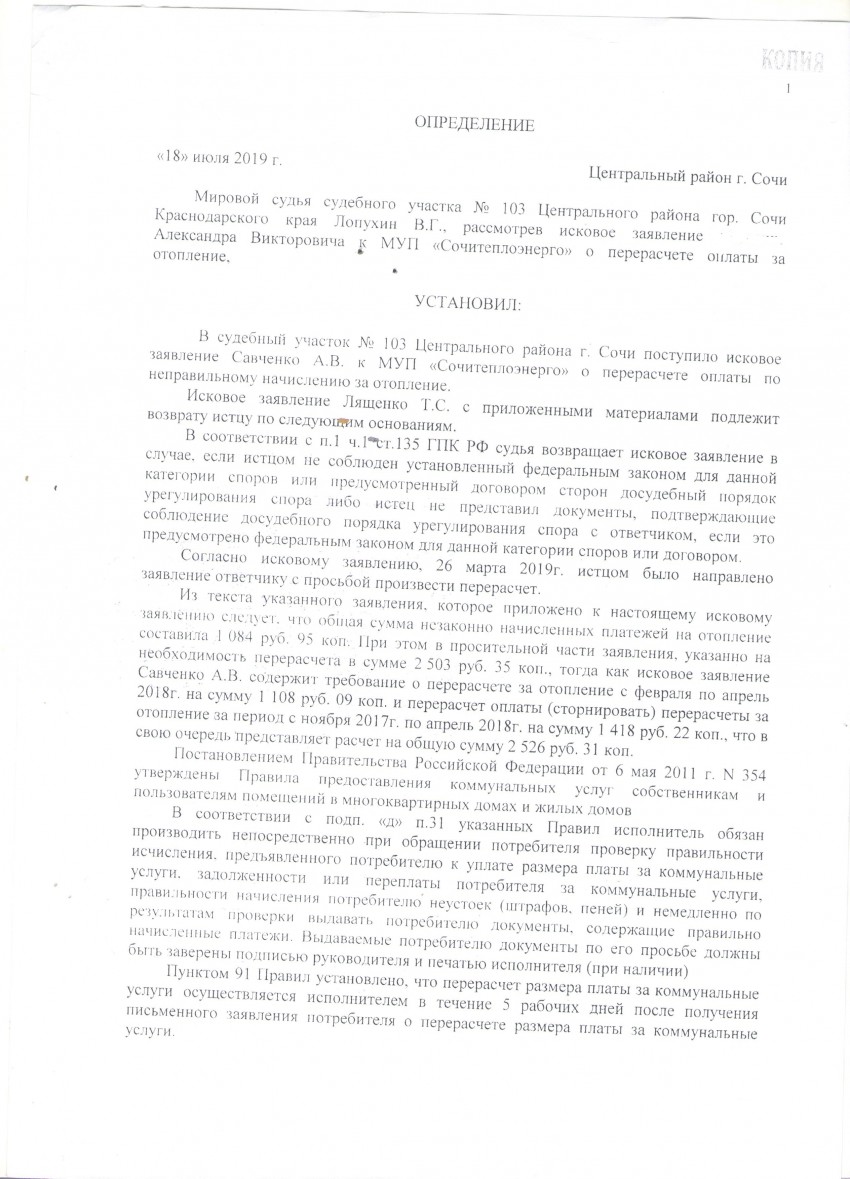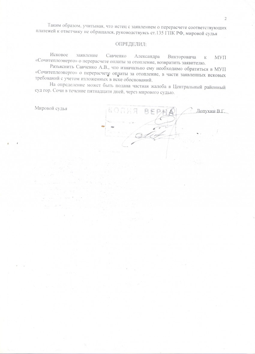 Уважаемый судья фамилия истца не Ляшенко, Вы видно под копирку делаете возврат исковых заявлений по Теплоэнерго, что дает повод усомниться в вашей объективности при рассмотрении этого дела. Я привык доводить все начатое до конца и доведу и это дело. А после отмены вашего определения (в чем я не сомневаюсь) я не забуду сообщить о ваших изысканиях в области права. Вы меня просто извините. Ведь они законодательству просто не соответствуют. О чем я думаю вы знаете и сами. В настоящее время Вы уже получили частную жалобу на свое определение Вот выдержки