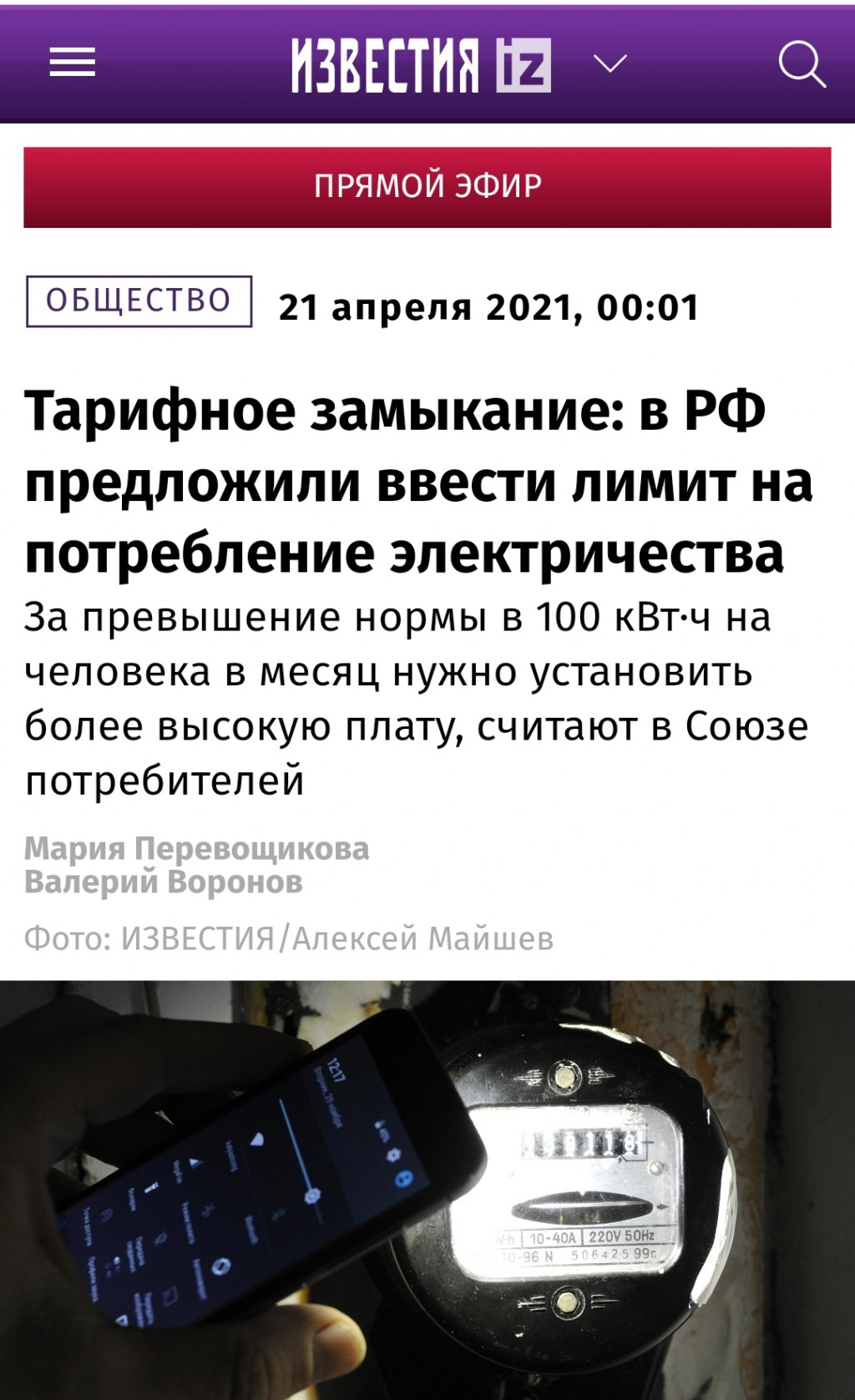Ну, весело. Те, кто должен защищать потребителей перешёл, по всей видимости, на «темную» сторону. Союз потребителей РФ предложил перейти на обязательную прогрессивную шкалу тарифов на электроэнергию для населения, когда за потребление свыше максимальной нормы устанавливается более высокая плата. Такую инициативу эти товарищи уже направили премьер-министру Михаилу Мишустину. За ориентир организация предложила взять максимум в 100 кВт•ч в месяц на человека, но дать региональным властям право корректировать норматив. Сегодня россияне потребляют в среднем по 90 кВт•ч в месяц на человека, говорят эксперты. Как вам инициатива? Вот у меня дома на двоих, дети съехали, с учетом сплитсистемы, индукционной плиты в месяц летом около 300 кВт. Получается шикую я, по мнению Союза потребителей. А у кого какие цифры?