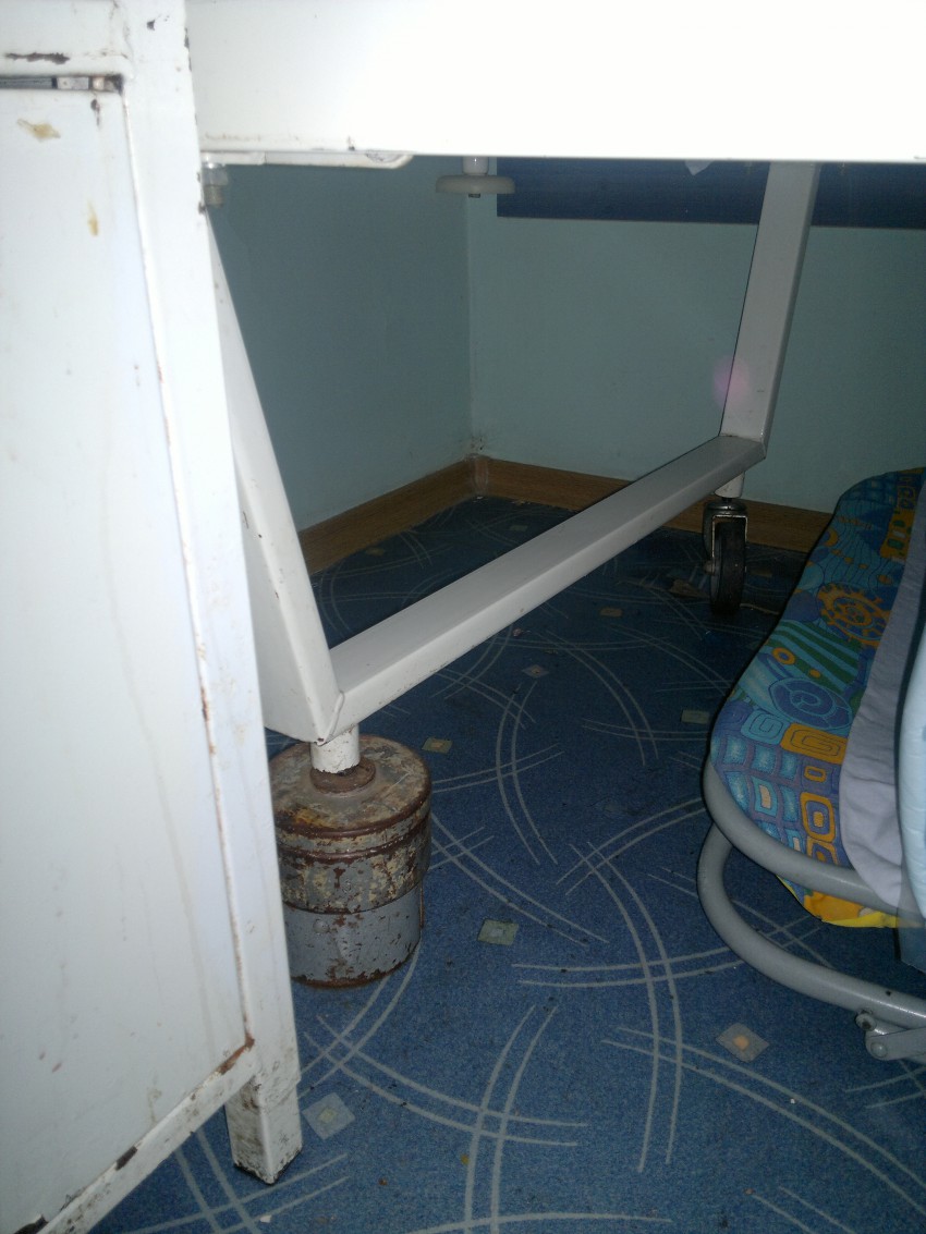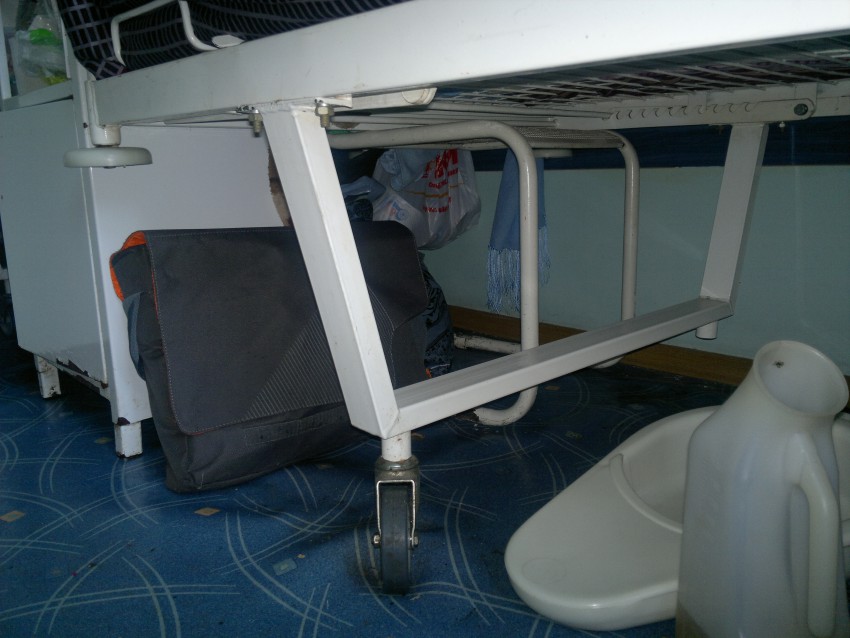 Почти все кровати не имеют колес. Вместо них приходиться видеть неприхотливые сооружения- у кого на что хватит фантазии: то стулья, которые держат кровати ( а тем, кто приходит навестить больных надо просто стоять или садиться на эту же самую кровать), то деревянные бруски вместо колес, то гири. Все это видно на фото.