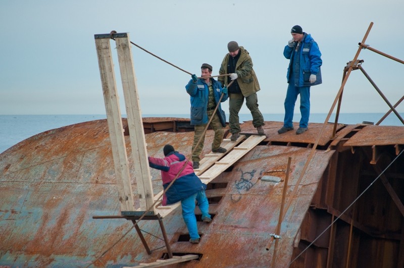 Носовая часть отломилась — но не сильно пострадала. Кормовая часть была пробита в корпусе — но машина и механизмы целы. Вполне можно было носовую часть приварить к кормовой части. Или сделать новую носовую часть.