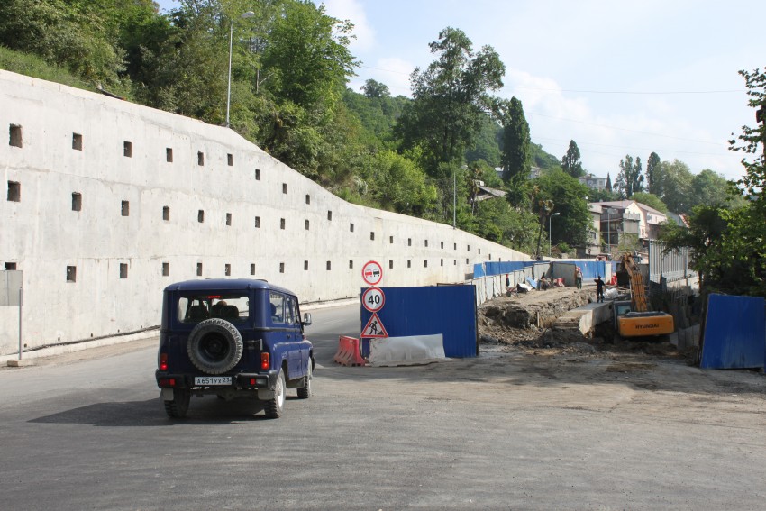 Полностью завершено обустройство подпорных стен протяженностью свыше 400 метров. Панельной облицовки здесь, кстати сказать, не предусмотрено. Они будут оштукатурены, окрашены, а ниши грунтовых анкеров закроются специальными щитами. На обновляемой улице 20-й горнострелковой дивизии в самом разгаре формирование проезжей части. Где-то полным ходом уплотняется земполотно, но часть дороги уже под асфальтом. Как сообщил пресс-службе департамента Краснодарского края по реализации полномочий при подготовке зимних Олимпийских игр 2014 года начальник участка генподрядного предприятия Сергей Ивакин, из 5200 квадратных метров на четырехполосном шоссе около трети уже заасфальтировано. Укладка покрытия ведется поэтапно, так что скоро будет очередное изменение схемы движения.