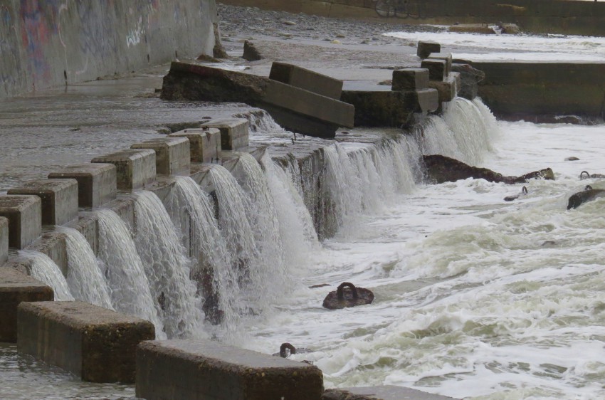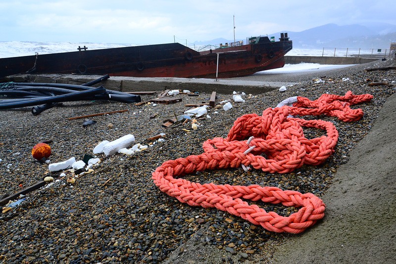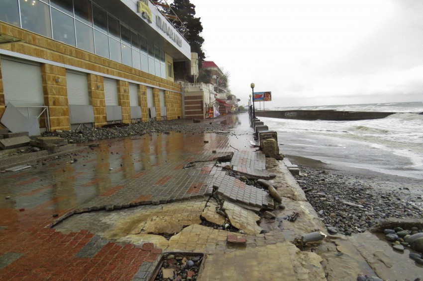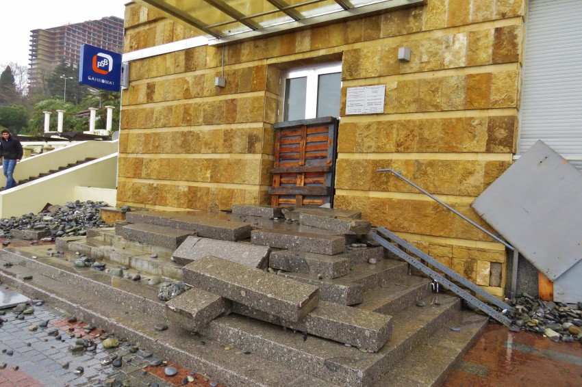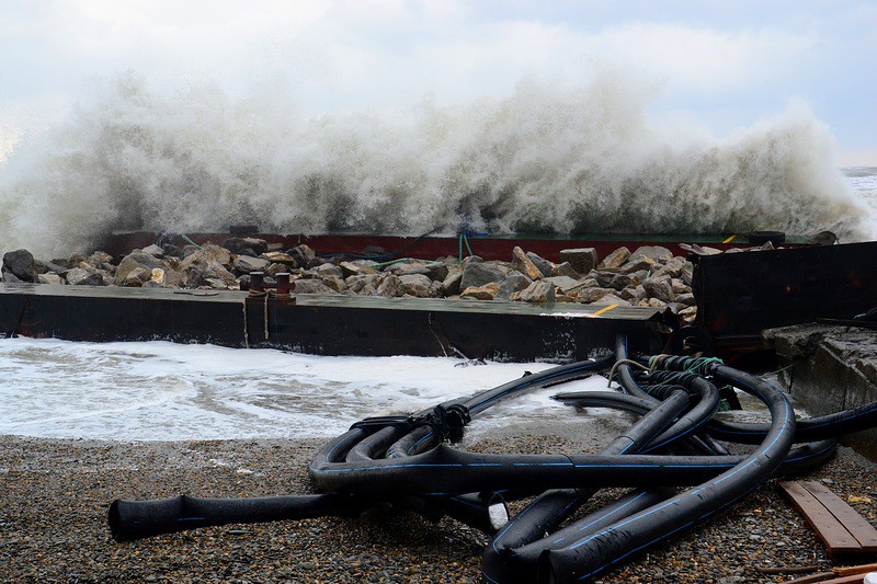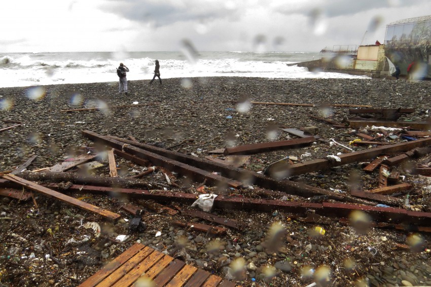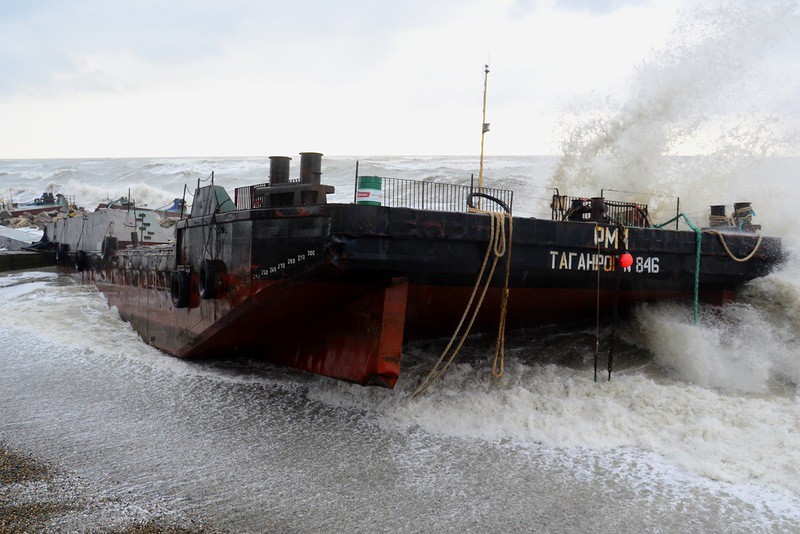 Пустую несамоходную баржу сильным волнением моря выбросило на берег недалеко от Курортного городка в Адлерском районе Сочи.