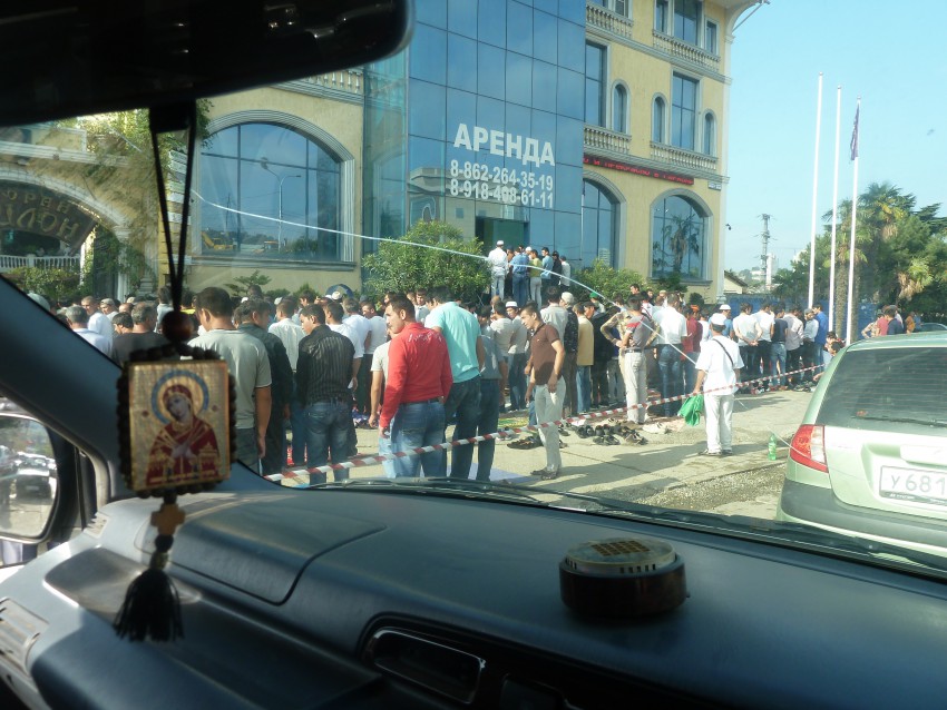 В Сочи уже традиционно мусульмане собираются в «Центре созидания и гармонии», более известном, как «Вавилон», что на повороте с Пластунской на Макаренко. Места внутри всем не хватило, поэтому молящиеся разместились на улице.