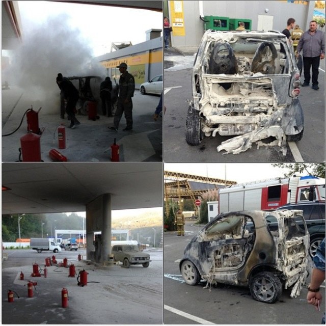 Вчера ехал в Дагомыс около 7 вечера, на территории заправки Роснефти горел Мерен, если правильно разглядел модель Smart. Огонь был метра три-четыре высотой. Пожарка была одна. Рыжая девчонка, хозяйка машины, судя по поведению ушла и не знала, что её машина успела сгореть.