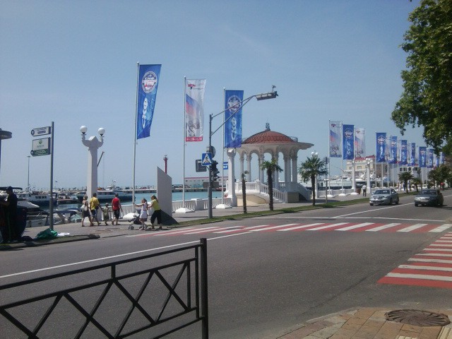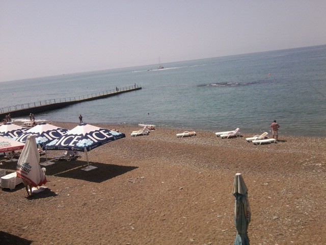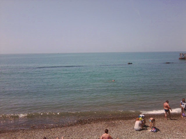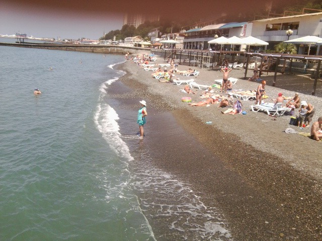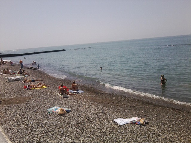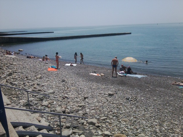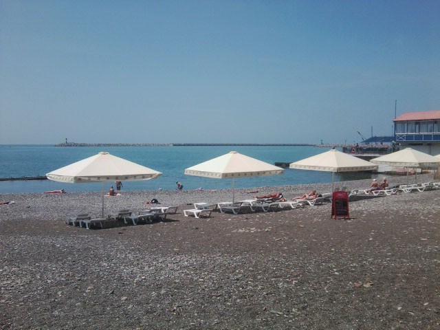 Хотя рановато для нас, сочинцев, и вода холодновата, но мы выбрались на пляж. Людей ещё не много, сезон только открылся. Но это даже приятно. Отдыхали на «Солнечном», но потом прошли до морпорта и убедились, что везде неплохо можно провести время. Пляжи ухоженные. Можно воспользоваться аэрариями, зонтами из пальмовых листьев. Видели и лежаки, но не знаю, платные ли они. Скорее всего — да.