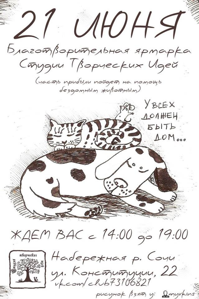 21 июня пройдет благотворительная акция «День сочинской собаки», в рамках которой будет выставка бездомных животных (собаки и кошки), ищущих дом и добрых хозяев. Для детей будут работать аниматоры, фотосессия с понравимшимися животными. Собранные средства пойдут на приобретение кормов, лекарств, средства ухода, стерилизацию животных и лечение наших подопечных, особенно тех, кто попадает под колеса машин. Если у вас есть не нужные клетки-переноски, поводки, ошейники, пеленки и другие средства ухода, приносите! Все животные, участвующие в выставке привиты и здоровы! Приходите!