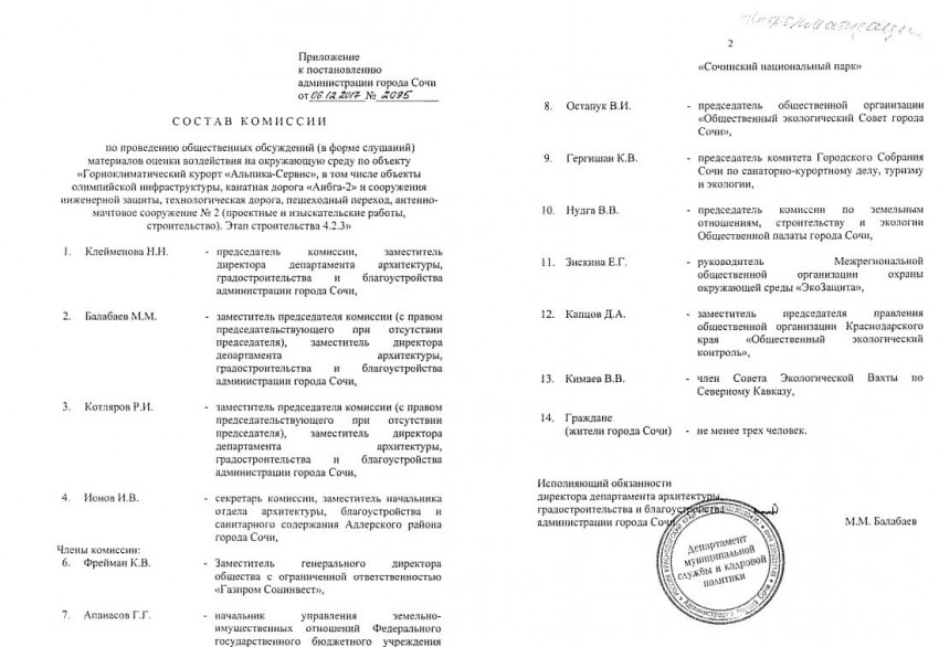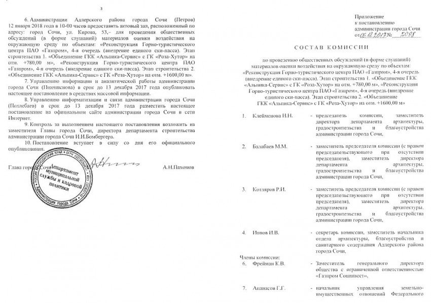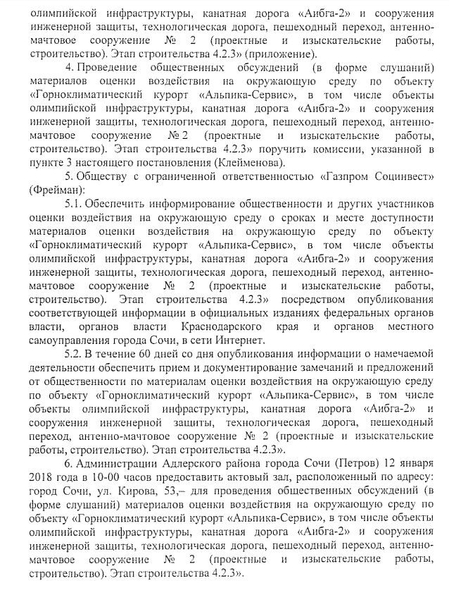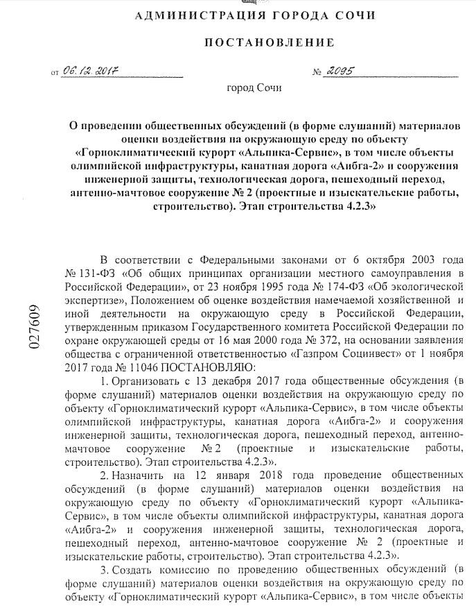 А также постановлением администрации города Сочи от 06.12.2017 № 2095 «О проведении общественных обсуждении (в форме слушании) материалов оценки воздействия на окружающую среду по объекту «Горноклиматический курорт «Альпика-Сервис», в том числе объекты олимпийской инфраструктуры, канатная дорога «Аибга-2» и сооружения инженерной защиты, технологическая дорога, пешеходный переход, антенно-мачтовое сооружение № 2 (проектные и изыскательские работы, строительство). Этап строительства 4.2.3»
