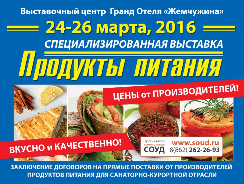 Выставка-ярмарка «Продукты питания» пройдёт с 24 по 26 марта в Гранд отеле «Жемчужина». Приглашаем специалистов для встречи с прямыми поставщиками, а горожан и гостей Сочи – продегустировать и приобрести свежайшие продукты напрямую от производителей.